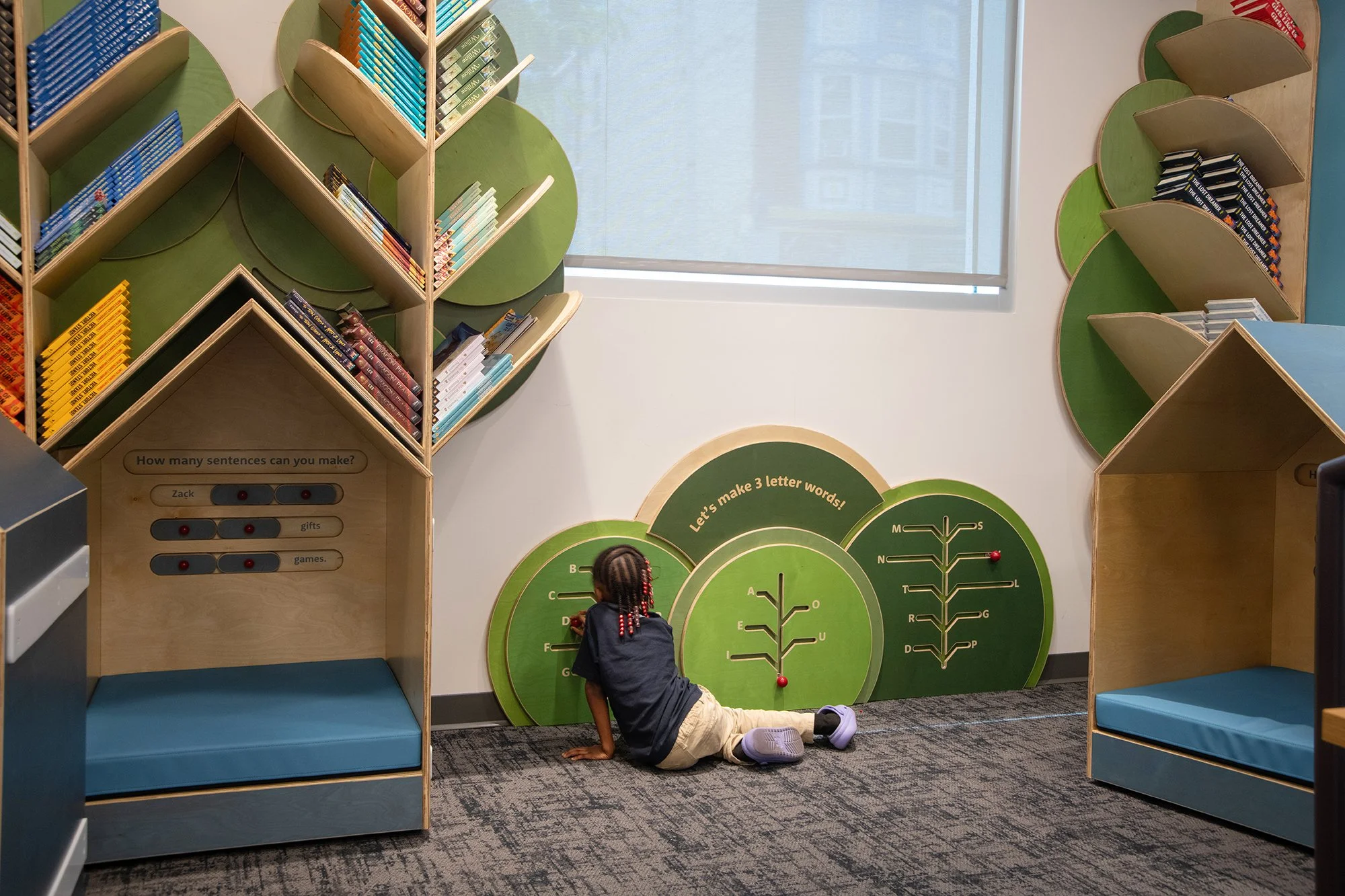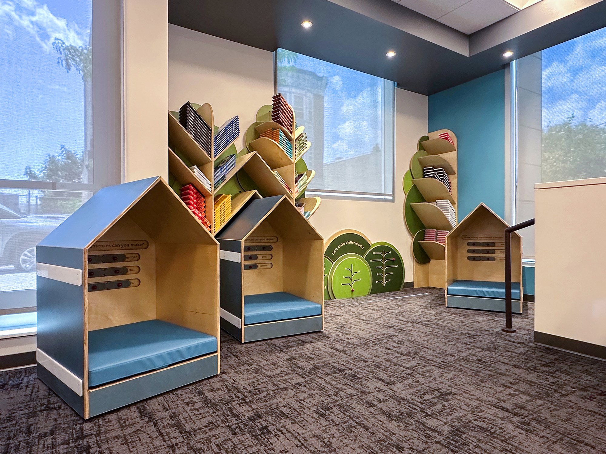 The installation needed to be durable, easy to maintain, ADA-conscious, and adaptable. It also needed to feel warm and inviting (not institutional) while supporting structured literacy outcomes rooted in Playful Learning principles.
